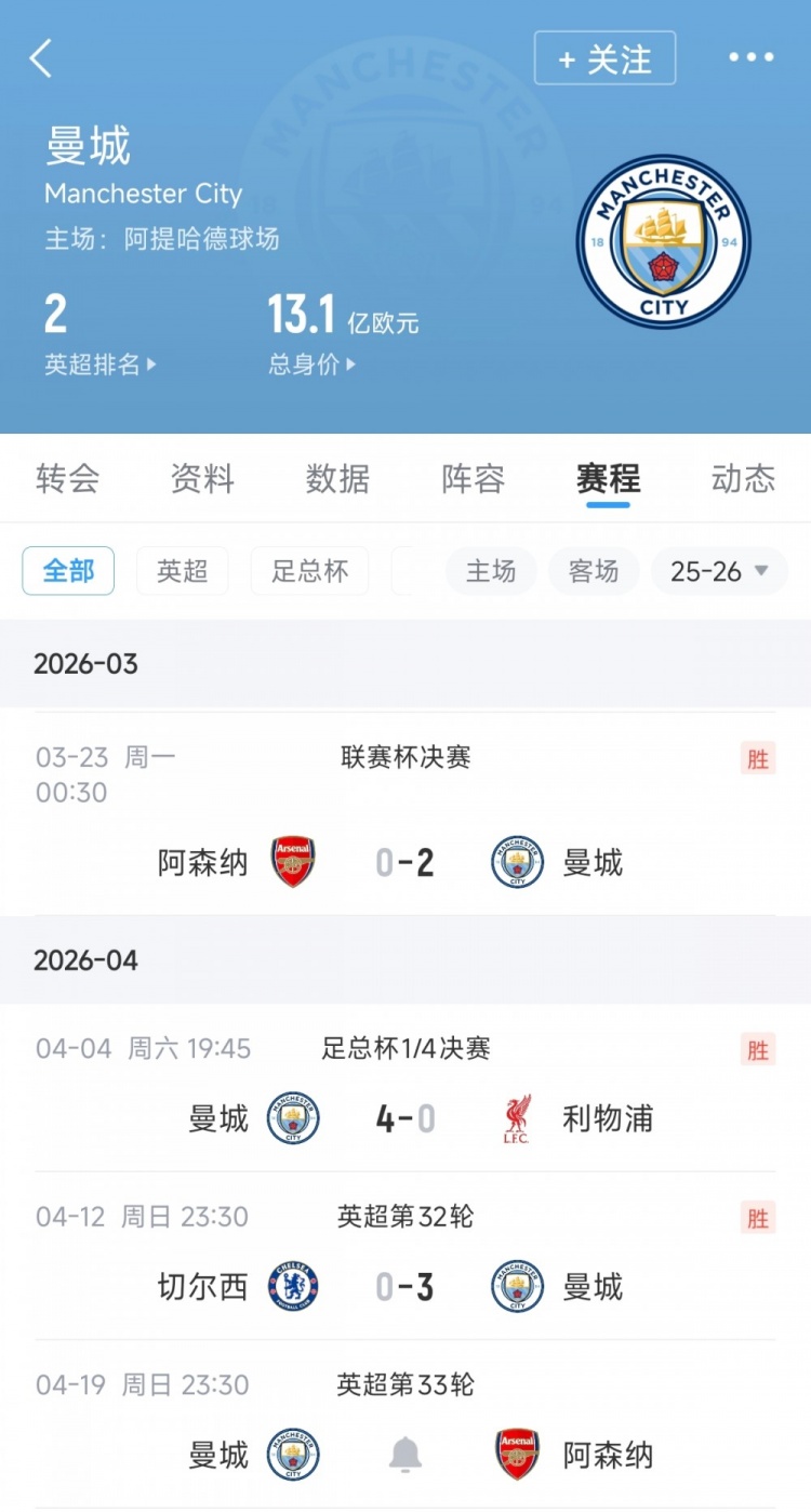 开云体育-无双模式冲三冠!曼城三线暴走总分9-0:力克阿森纳+狂胜红军蓝军 byxiaoqiao 发表于2026年04月26日 4月13日讯 英超第32轮,曼城3-0大胜切尔西,少赛一场距离榜首阿森纳还差6分。最近三场比赛,曼城三线暴走:2-0击败阿森纳夺得联赛杯,4-0狂胜利物浦挺进足总杯半决赛,3-0完胜切尔西冲击英超冠军。三场比赛面对英格兰足坛的三大豪门,曼城豪取9-0的总比分,堪称无双模式。目前曼城已经夺得联赛杯,他们足总杯则是晋级半决赛将战南安普顿。英超方面,曼城下一轮正是打阿森纳,直面争冠对手。 你可能感兴趣的内容 上一篇文章 kaiyun体育app-刘建宏:金童奖应空缺 23岁还需政策保护有天理吗 发表于2026年04月09日 byxiaoqiao 查看文章 下一篇文章 开云官方-太阳报:切尔西名宿特里将与财团联手,收购英乙球队科尔切斯特联 发表于2026年04月26日 byxiaoqiao 查看文章 你可能会喜欢